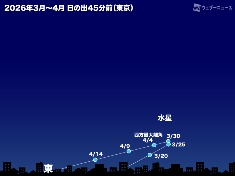 4月4日(土)に「水星」が太陽から最も離れて「西方最大離角(※)」を迎えます。水星が明け方の東~東南東の低空に、0.3等の明るさで輝きます。