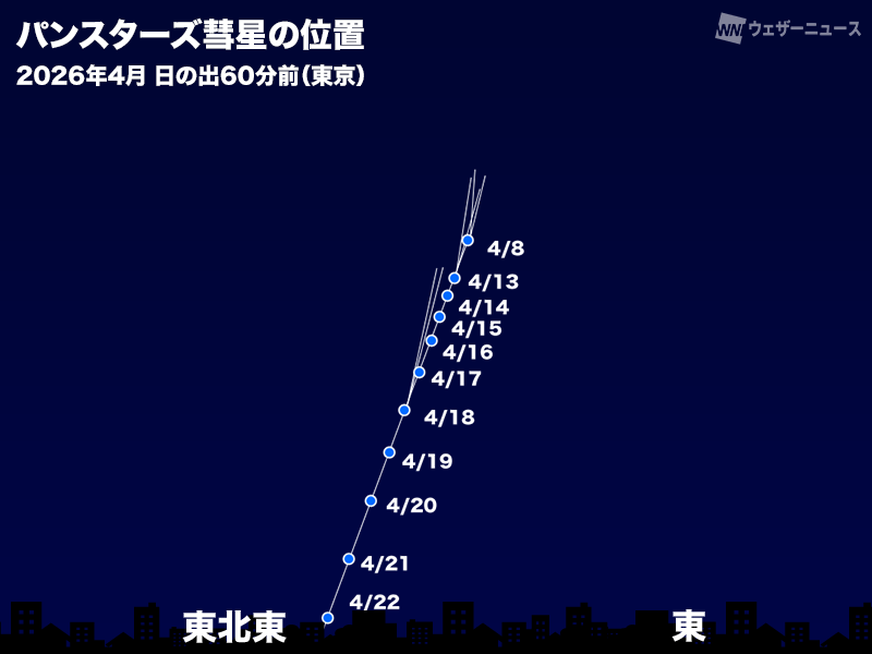 日の出60分前でパンスターズ彗星の高度は10~20度ほどのため、東の空が開けた場所からお楽しみください。順調に増光すれば、空の暗いところでは肉眼でも見られるかもしれません。