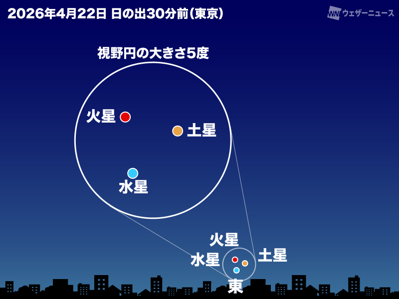 日の出45分前の水星の高度は約3度と非常に低いため、東~東南東の方角の水平線が開けた場所から探してみてください。双眼鏡があると見やすくなります。