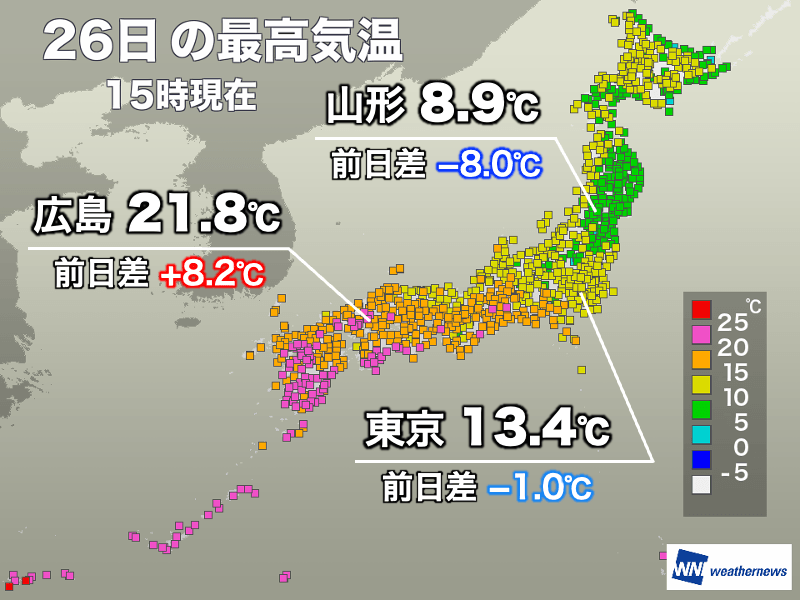 一方、東寄りの冷たい風が吹き付けている関東から東北は、気温の上昇が鈍くなりました。東京都心の最高気温は13時13分に観測した13.4℃、山形市は13時28分に観測した8.9℃です。体感の投稿は「肌寒い」がほとんどとなりました。