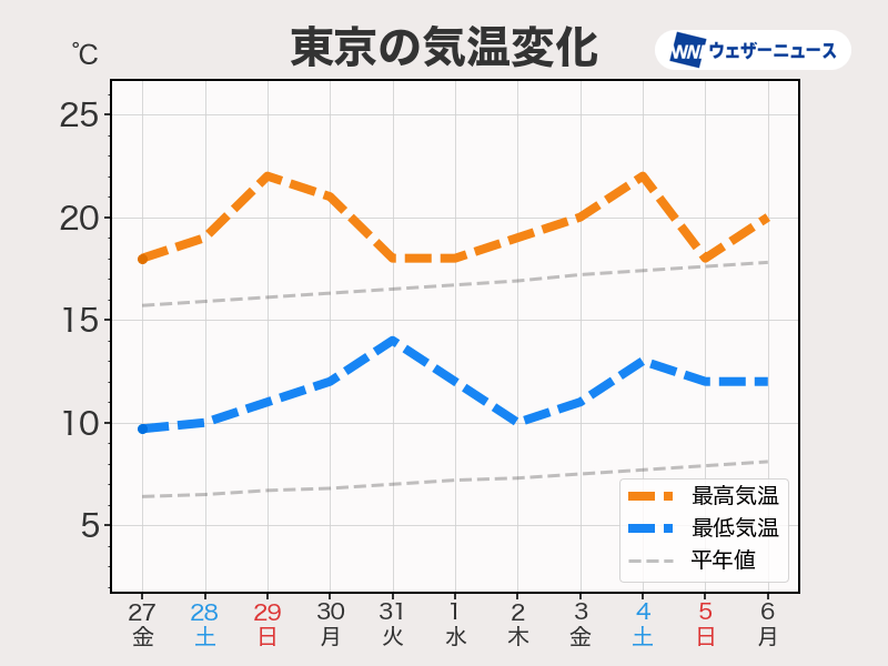 この先一週間の気温は、平年並み〜高めで推移する見込みです。週末は西日本や東日本を中心に20℃前後まで上がる所が多く、春らしい暖かさとなりそうです。
