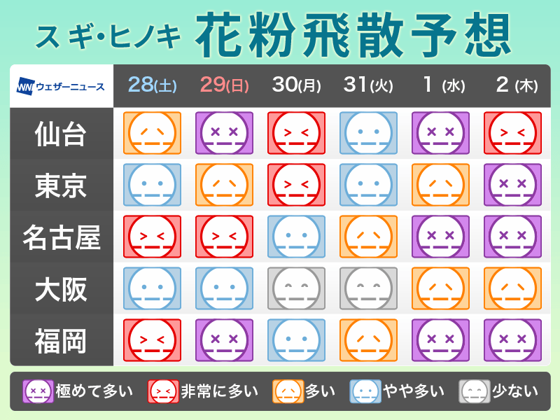 東北から北陸はスギ花粉のピークを迎えています。関東から西日本では徐々にスギ花粉のピークを越えつつあり、ヒノキ花粉が本格化している所もあります。特に雨の後は花粉が一気に飛びやすくなるため、大量飛散に注意が必要です。
