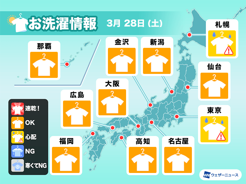 東北南部から九州は、晴れて外干しOKの所が多くなります。スギ花粉やヒノキ花粉が多く飛散しているので、花粉症の方は部屋干しにするなどの対策がおすすめです。