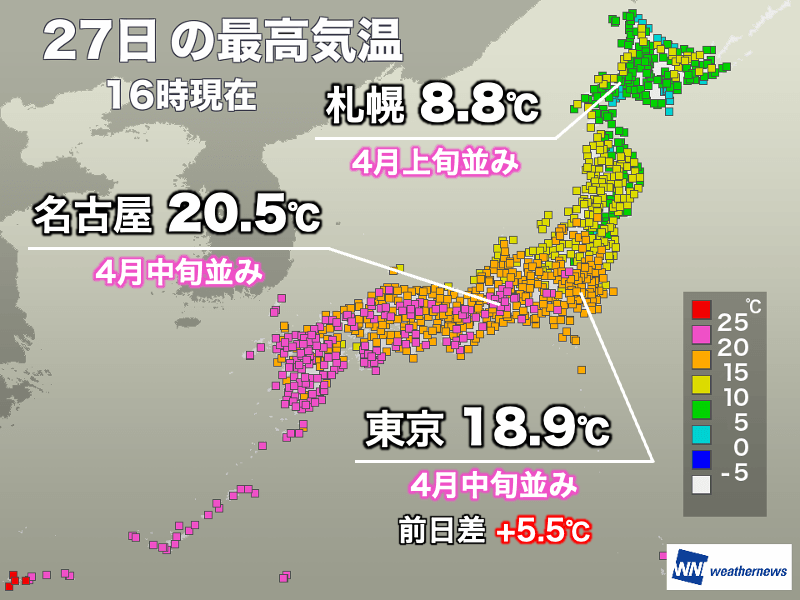 今日27日(金)もよく晴れた東海以西を中心に気温が高くなり、名古屋市など今年一番の暖かさになりました。東京都心も午前を中心に晴れて、昨日26日(木)より大幅に気温が上がっています。