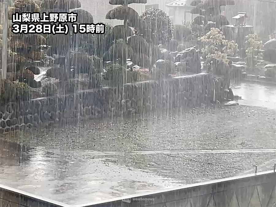 局地的に発達した雨雲のもとでは、雷を伴って雨が強まっているところもあります。山梨県上野原のアメダスでは15時30分までの1時間に6mmの雨を観測しました。上野原市周辺からは15時前に雨が強く降る状況のウェザーリポートが増加しました。一部の雨雲は弱まりながら平野部にも流れ込み、東京都町田市や神奈川県相模原市周辺でも雨となっています。