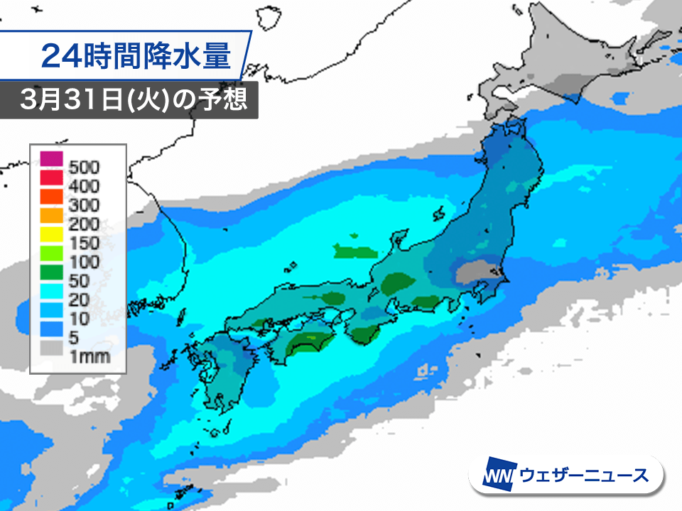 31日(火)は九州〜東北の広範囲で雨