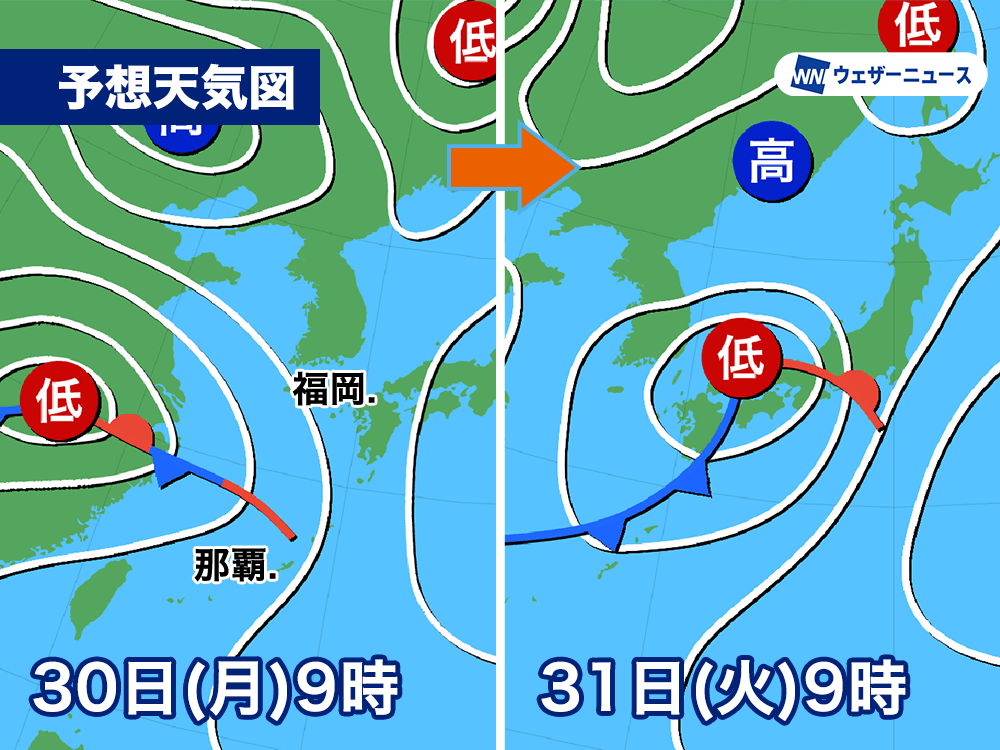 大陸から東シナ海にのびる停滞前線上に低気圧が発生し、30日(月)はこれらの雨雲が東進してきます。