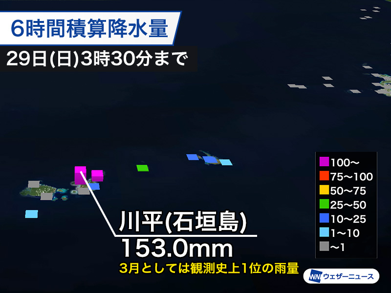 石垣島の川平に設置されたアメダスでは午前3時30分までの6時間で153mmの雨を観測しました。3月としては観測史上1位の雨量です。