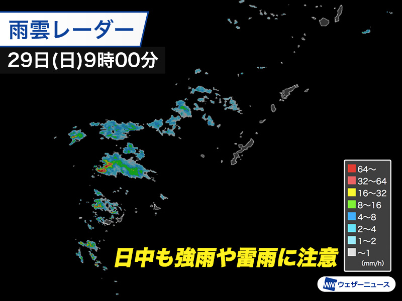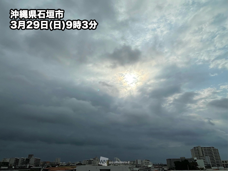 大陸からのびる前線が先島諸島周辺に停滞しています。昨夜遅くから今日29日の未明にかけて前線の発達した雨雲が流れ込み、先島諸島では局地的に大雨となっています。