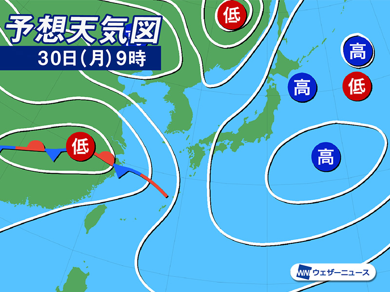 明日30日(月)は東シナ海から前線と低気圧が接近して西日本では九州から徐々に雨のエリアが拡大します。
