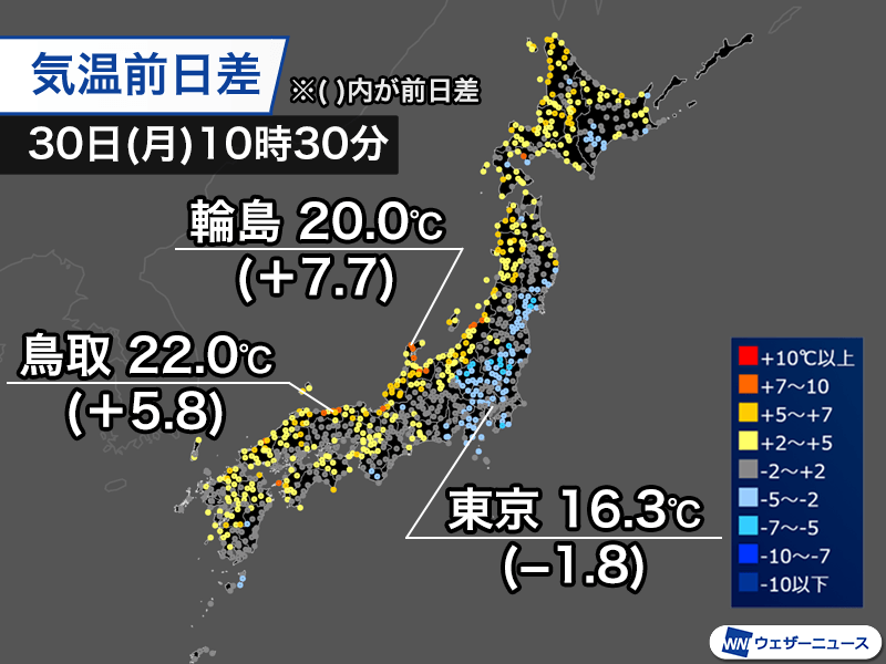 特に高気圧の周囲を吹く南寄りの風が山越えとなっている日本海側で弱いながらもフェーン現象が発生し、気温の上昇が目立ちます。昨日の同じ時間帯に比べて5℃以上高い所があり、10時30分の気温は鳥取市で5.8℃高い22.0℃、石川県輪島市で7.7℃高い20.0℃です。