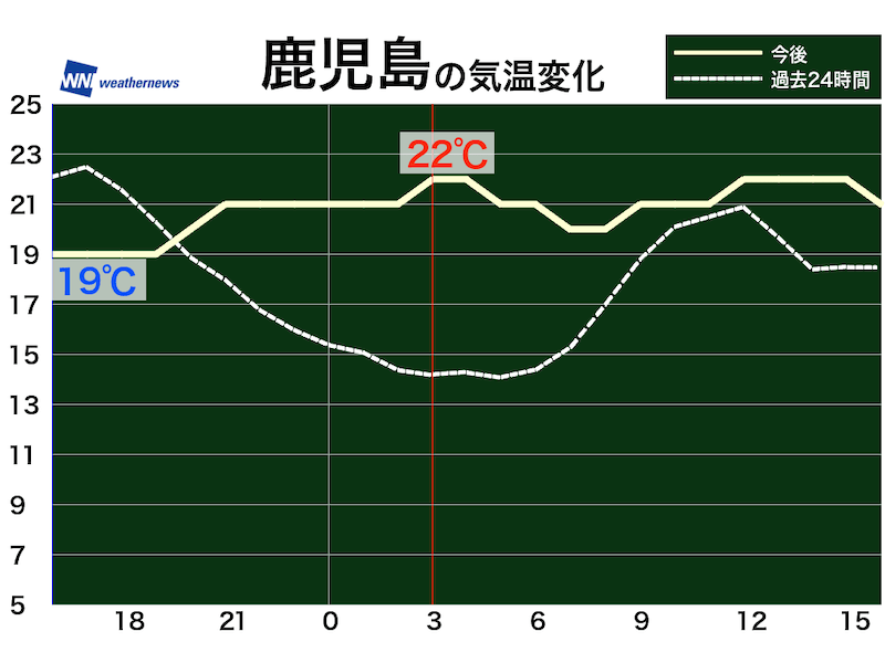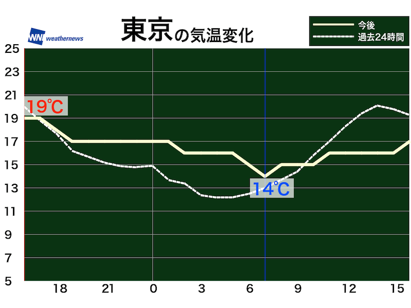 朝はあまり気温が下がらず、今朝より高めです。昼間は気温が横ばいで今日よりも低く、雨も降るため体感温度は低下します。