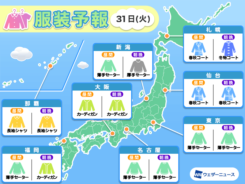 今日と明日の気温変化を比較して、気温に適した服装をご提案します。ウェザーニュースの服装予報もご活用ください。