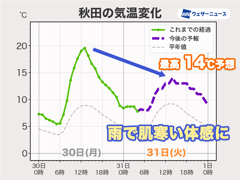 昼間の気温は昨日30日(月)に比べると大きく下がり、特に東北北部では10℃前後と少し肌寒く感じるくらいです。雨具とともに少し厚手の上着が必要になります。