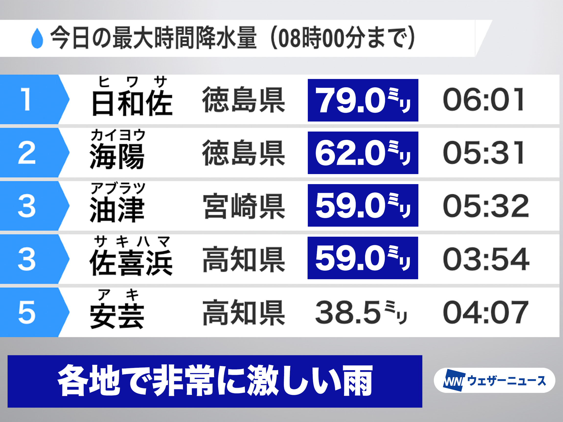 今朝は広範囲で本降りの雨となっており、特に四国や九州で雨雲が発達しています。徳島県のアメダス日和佐では6時01分までの1時間に79.0mm、宮崎県のアメダス油津では5時32分までの1時間に59.0mmの非常に激しい雨をそれぞれ観測しました。日和佐や油津を含む6地点で、3月としては観測開始以来1位の値を更新しています。