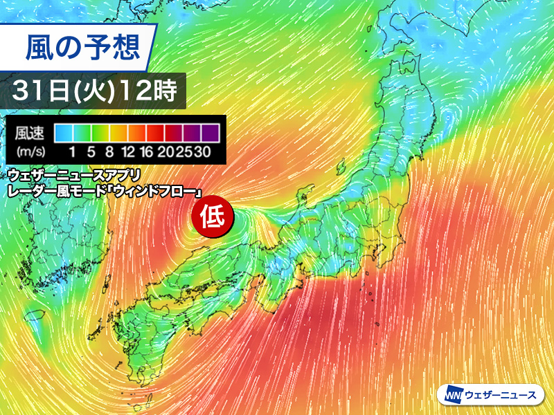 特に低気圧に吹き込む風が強まり、西日本から東日本の太平洋沿岸では平均15m/s前後の強風となる見込みです。瞬間的には20m/sを超えるような風が吹き、雨が加わることで横殴りとなります。