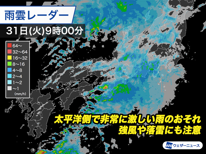 今日31日(火)は大雨や冠水に警戒 朝は徳島や高知で非常に激しい雨