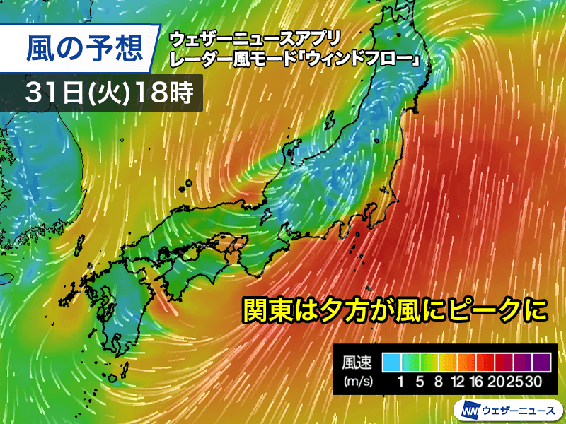 関東は夕方から夜が風のピークで、南部の沿岸では20〜25m/sの瞬間風速が予想されます。