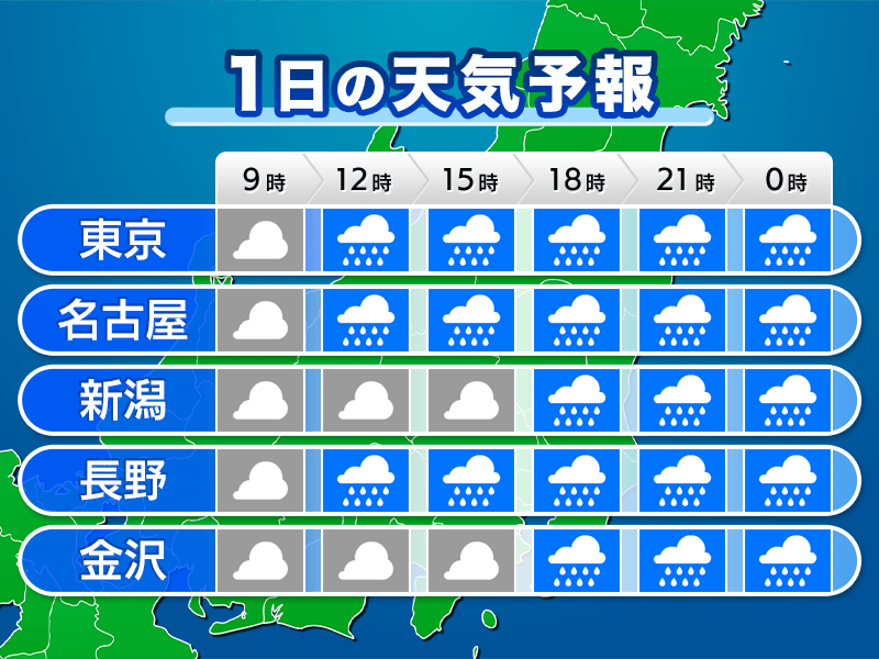 関東や東海は朝は晴れ間が見えても、だんだんと雲が厚みを増していきます。昼頃からは再び雨が降りだし、帰宅時間帯は本降りの雨になる見通しです。新年度初日も傘をお忘れなく。