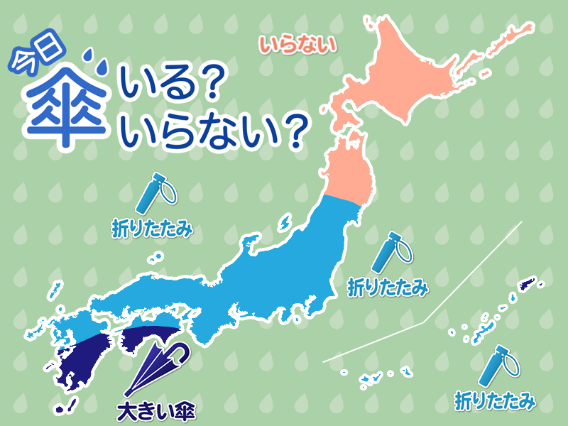 九州北部から東北南部にかけての広い範囲で雨の降ることがあります。外出時に雨が降っていなくても折りたたみ傘をお持ちください。