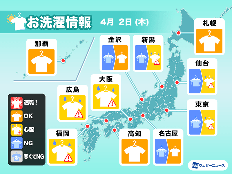 ただ、晴れる西日本も油断はできません。上空の気圧の谷が通過するため、九州北部や山陰、瀬戸内などを雨雲が通過する可能性があります。一時的ではありますが雨の可能性があるため、干したままで外出するのは心配です。