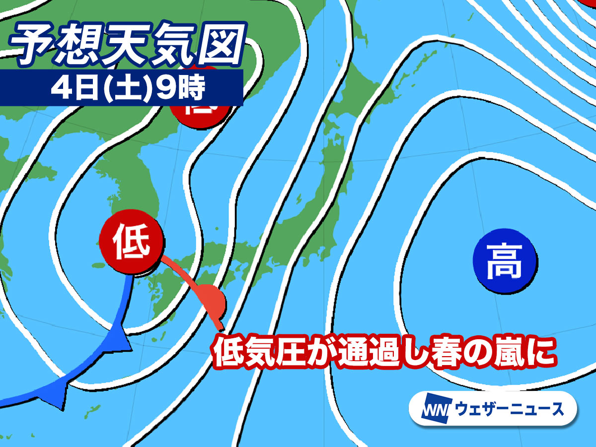 今週末は再び低気圧が東シナ海から日本海へ進み、西日本や東日本で雨や風が強まる可能性があります。4日(土)は西日本〜東日本の広範囲で本降りの雨となる予想です。