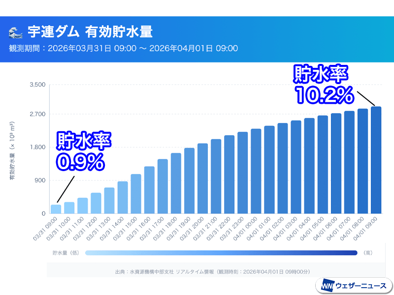 昨秋からの少雨により一時、貯水率が0%となった豊川水系の宇連ダムにも多くの雨水が流入しています。31日(火)9時の時点で0.9%だった貯水率は今日4月1日(水)9時に10.2%まで増加しました。