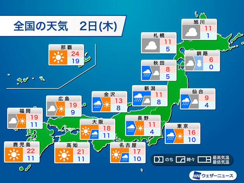 明日2日(木)は天気が回復する西日本で再び気温が上昇します。九州南部や四国など太平洋側では20℃を超える所があり、そのほかの各地も18℃前後で過ごしやすい陽気になる見込みです。