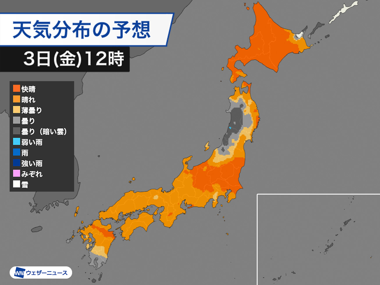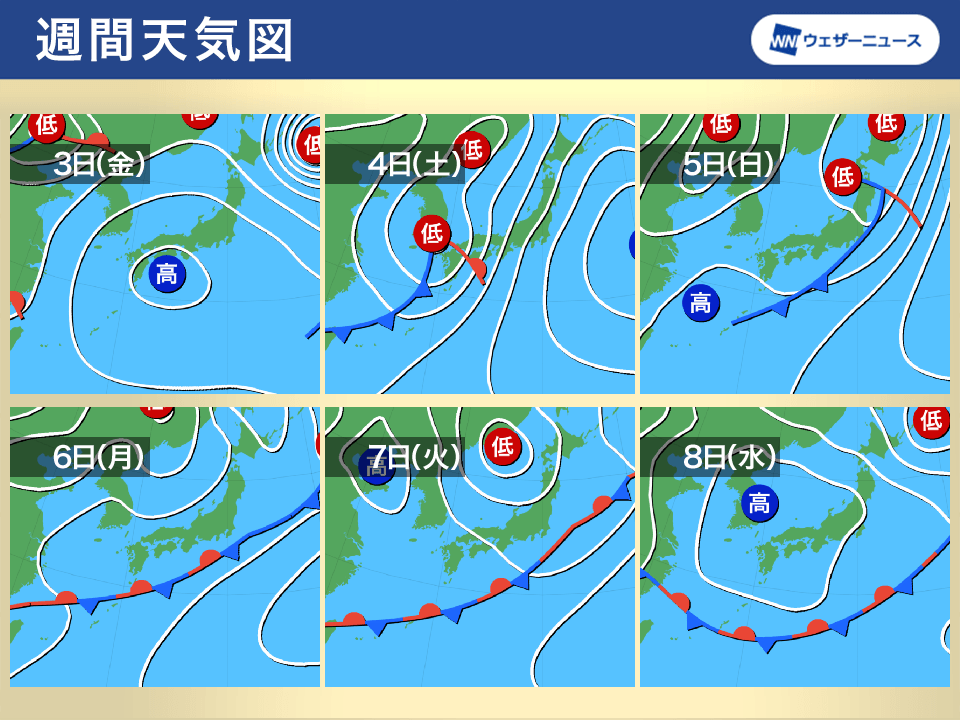 明日3日(金)は移動性高気圧に覆われ、全国的に晴れるところが多くなる見込みです。各地で穏やかな空となりそうです。