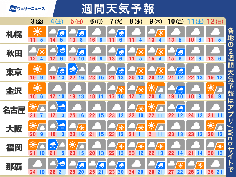 また、北日本などの積雪エリアでは気温上昇による融雪が進むため、地面のぬかるみや雪崩に引き続きご注意ください。