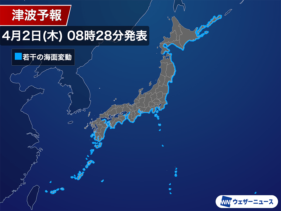 気象庁は津波予報(若干の海面変動)を発表しました。国内で若干の海面変動が予想される沿岸は次のとおりです。