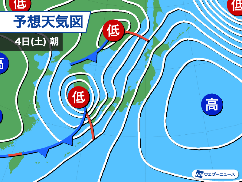 高気圧と低気圧の間で気圧差が大きくなり、全国的に風が強まります。特に、前線の接近前は南寄りの風が強く吹き、午前中は西日本で、午後は東日本や北日本でも春の嵐となる見通しです。