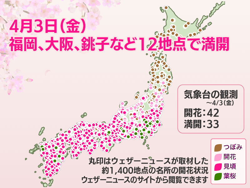 今日の桜開花状況 4月3日(金) 福岡、大阪、銚子など12地点で満開