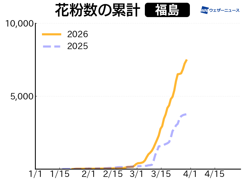 東北では現在スギ花粉の飛散ピークとなっていて、その量は昨年よりも多い所がほとんどです。飛散しやすい状況は4月中旬にかけて続くため、花粉症の方は引き続き万全な対策を行ってください。