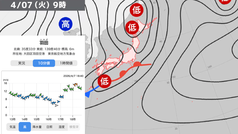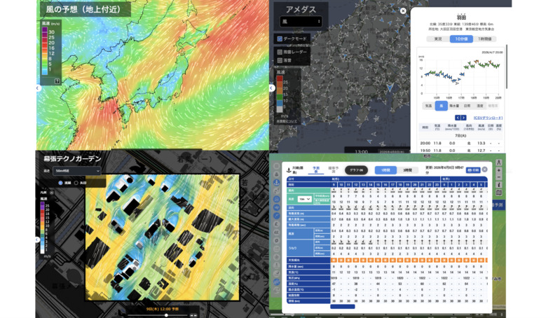 高所作業や大型構造物の解体といった屋外作業では、「注意報が出ているかどうか」だけでなく、風の収束・シアーの有無、前線通過のタイミングといった、より精緻な気象情報の活用が求められます。