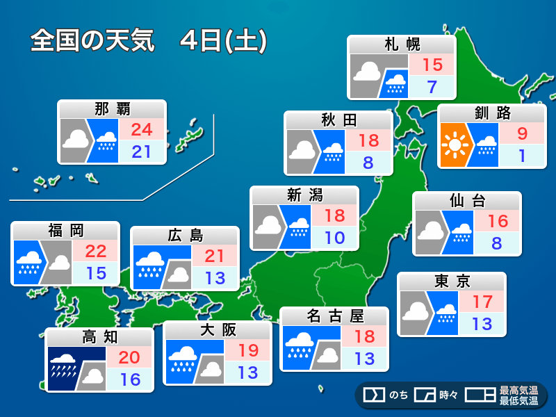 予想最高気温は東京都心で17℃、名古屋市で18℃、大阪市で19℃、福岡市で22℃となっています。人によっては少し不快感のある雨になるかもしれません。