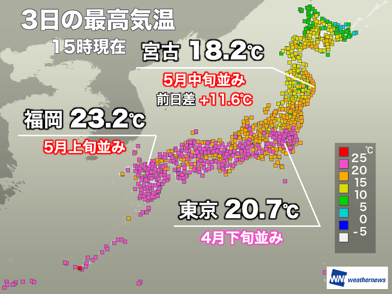 関東から西の地域は20℃を超えた所がほとんどで、東京都心の最高気温は13時56分に観測した20.7℃、福岡市は12時48分に観測した23.2℃となりました。