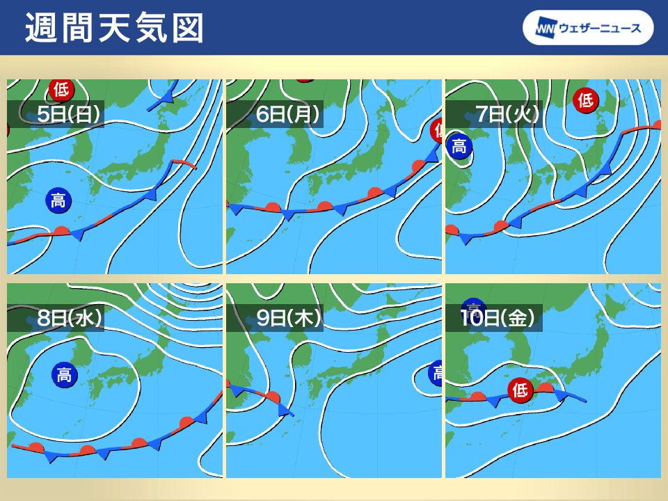明後日5日(日)になると低気圧は東へ離れていきますが、日本付近には暖気が残り、西から天気が回復することで気温が上がる見通しです。また、週明け6日(月)には大陸から次の低気圧が北海道の北へ進むことで、さらに暖気が北上します。