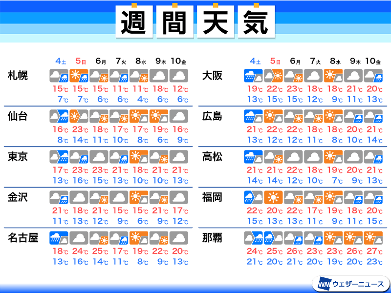 極端な寒さはない一方、気温が上がる日は初夏の陽気となって気温変化が大きくなりそうです。服装選びに注意して、体調を崩さないようにしてください。
