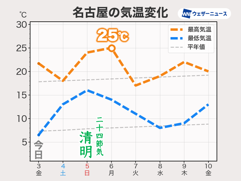 その後、7日(火)頃は南の海上に停滞する前線が北上して雲が広がることや、低気圧通過後に流れ込む寒気の影響で、気温が下がる見通しです。名古屋市の気温変化を見ると、6日(月)から7日(火)は10℃近く下がる予想になっています。ただ、そのまま気温の低い日が続くことはなく、週後半には再び西から暖気が北上する予想です。