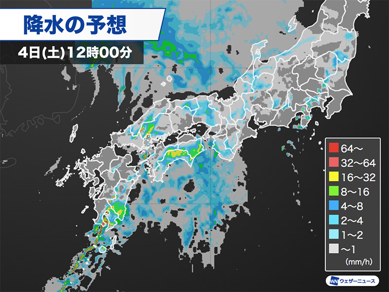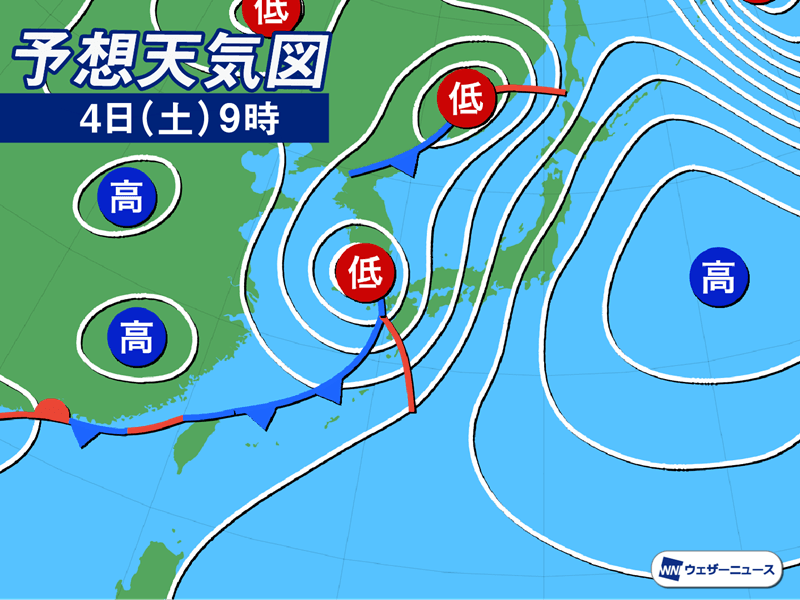 明日5日(日)には低気圧や前線は海上に離れ、西日本を中心に天気は回復に向かう見込みです。