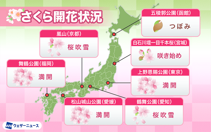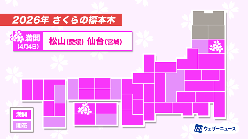 今日の桜開花状況 4月4日(土) 松山(愛媛)と仙台(宮城)で桜満開の発表