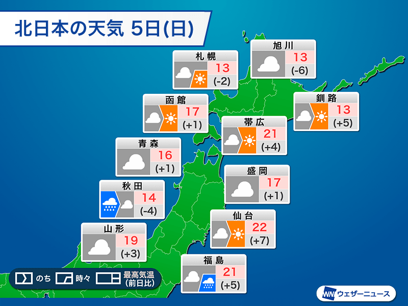 予想最高気温は帯広で21℃、福島や仙台で22℃の予想です。仙台で20℃以上になれば今年初です。また、釧路は13℃予想ですが、昨日から5℃上がります。