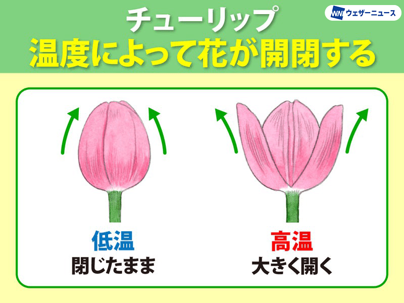 個体などによる違いはありますが、チューリップは概ね10℃以下では花を閉じたままで、15℃ぐらいで開き始め、20℃以上では大きく開くと言われています。