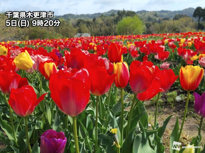 今日の西日本や東日本は、最高気温が20℃以上となる所が多く、一部では25℃以上の夏日となる可能性もあります。大きく花開いた満開のチューリップが目を楽しませてくれそうです。