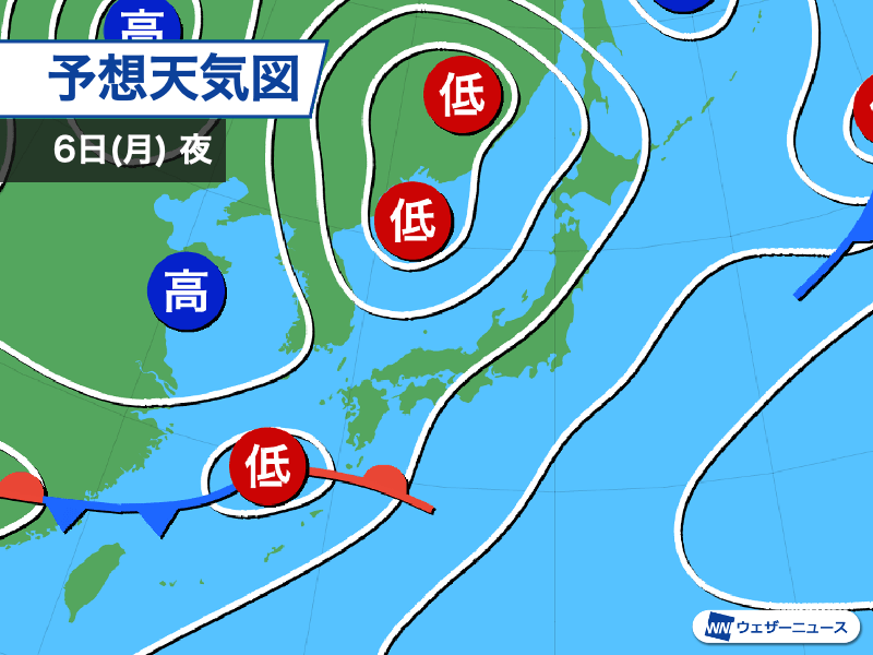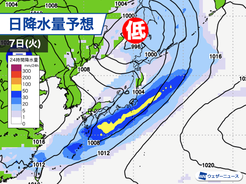 雨雲はそれぞれ東進し、7日(火)を中心に広い範囲で雨が降る見込みです。太平洋側の低気圧や前線に向かって暖かく湿った空気が流れ込むため、伊豆諸島や沖縄・奄美では雷を伴った短時間強雨や大雨のおそれがあります。