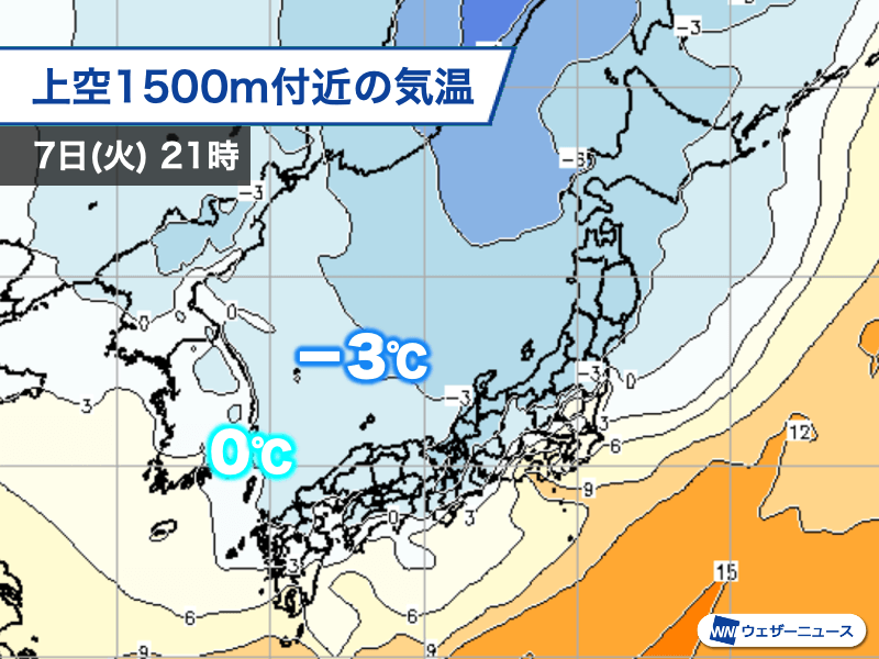 寒気の流入に伴い、7日(火)の午後は日本海側から気温が下がり、夜は朝よりも冷える所が多くなる見込みです。