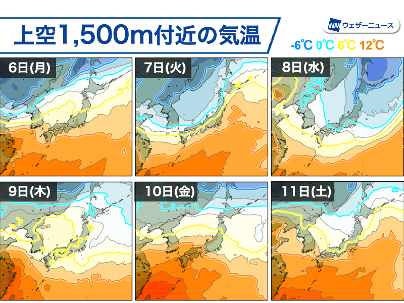 上空1500m付近の気温の予想を見ると、7日(火)の朝時点で0℃のラインが本州の日本海側に南下しています。また、8日(水)の朝にはこのラインが中国地方から関東付近まで南下し、北海道には−6℃以下の空気が流れ込む見通しです。
