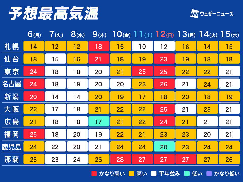 昼間の気温もそれほど高くなく、平年並みとなる所が多い予想です。朝晩と昼間の気温差は大きくなるため、体調管理にご注意ください。
