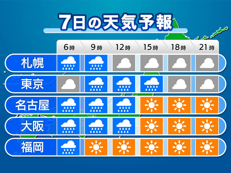 4月7日(火)は低気圧や前線の影響で、広い範囲で雨が降ります。沿岸部を中心に強風に注意が必要です。西日本は日中のうちに天気が回復しますが、関東から北日本はすっきりしない天気が続きます。